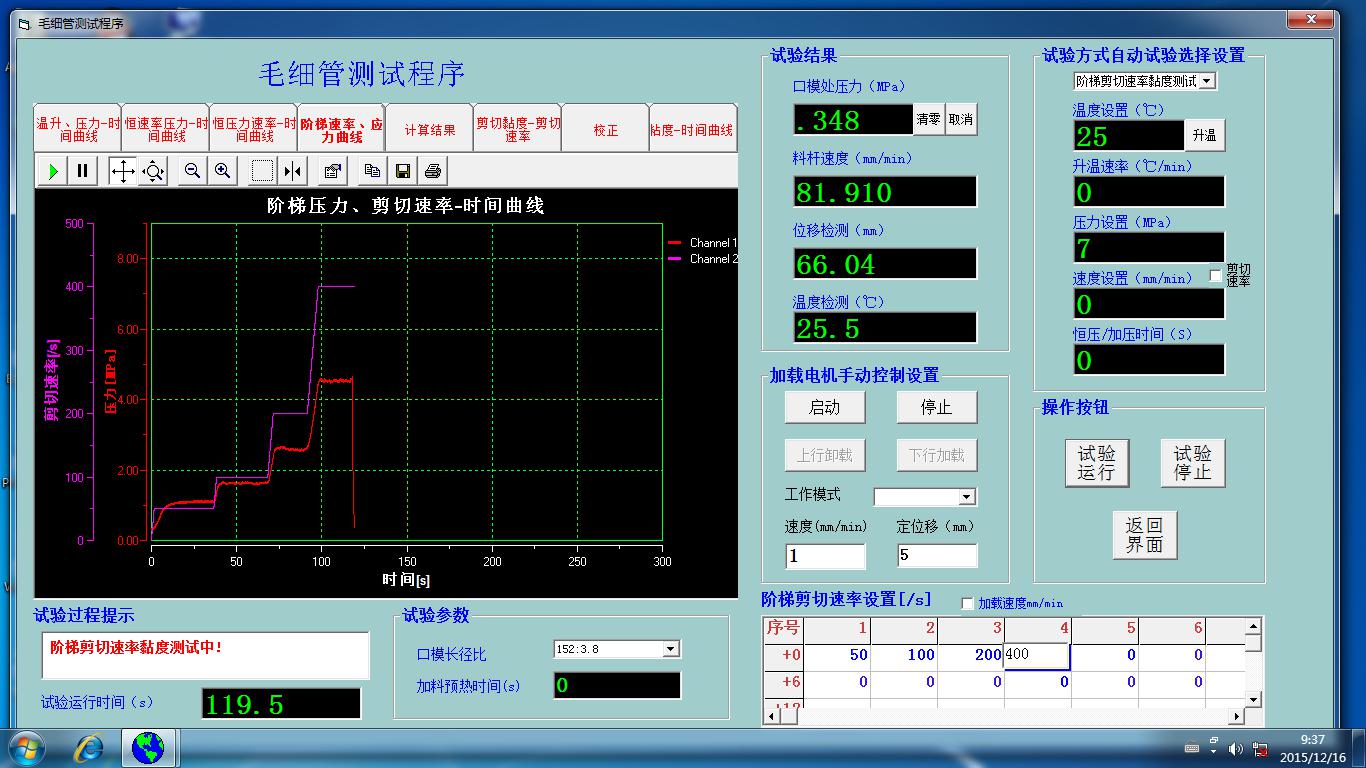 MLW-400A毛細管流變儀是一種用于在高應(yīng)力下測量剪切應(yīng)力率的裝置,可以任意恒剪切速率或活塞桿速度測量,通過計算機測定各種壓力作用時,各種規(guī)格的毛細管在不同的升溫速率下,不同溫度時的擠出速度。它的核心部分為一套精致的毛細管,具有不同的長徑比(通常L/D=10/1,20/1,30/1,40/1等);料筒周圍為恒溫加熱套,內(nèi)有電熱絲;料筒內(nèi)物料的上部為液壓驅(qū)動的柱塞。物料經(jīng)加熱變?yōu)槿垠w后,在柱塞高壓作用下,強迫物料從毛細管擠出,由此測量物料的黏彈性。主要測定高分子材料在毛細管中的“剪切應(yīng)力”和“剪切速率”的關(guān)系!