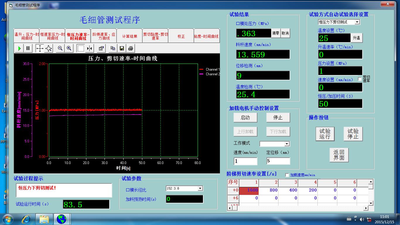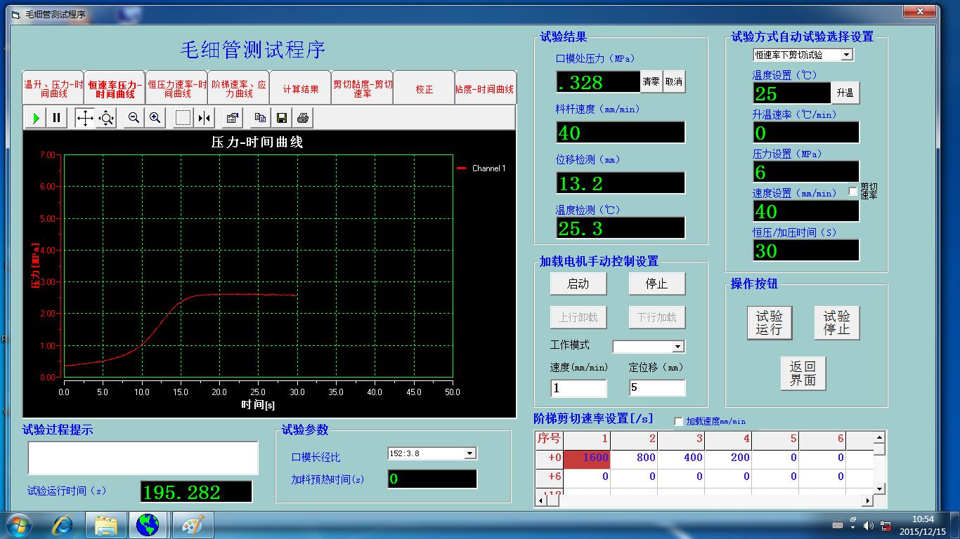 物料在電加熱的料桶里被加熱熔融,料桶的下部安裝有一定規(guī)格的毛細管口模(有不同直徑0.25~2mm和不同長度的0.25~40mm),溫度穩(wěn)定后,料桶上部的料桿在驅(qū)動馬達的帶動下以一定的速度或以一定規(guī)律變化的速度把物料從毛細管口模種擠出來。在擠出的過程中,可以測量出毛細管口模入口出的壓力,在結(jié)合已知的速度參數(shù)、口模和料桶參數(shù)、以及流變學(xué)模型,從而計算出在不同剪切速率下熔體的剪切粘度。