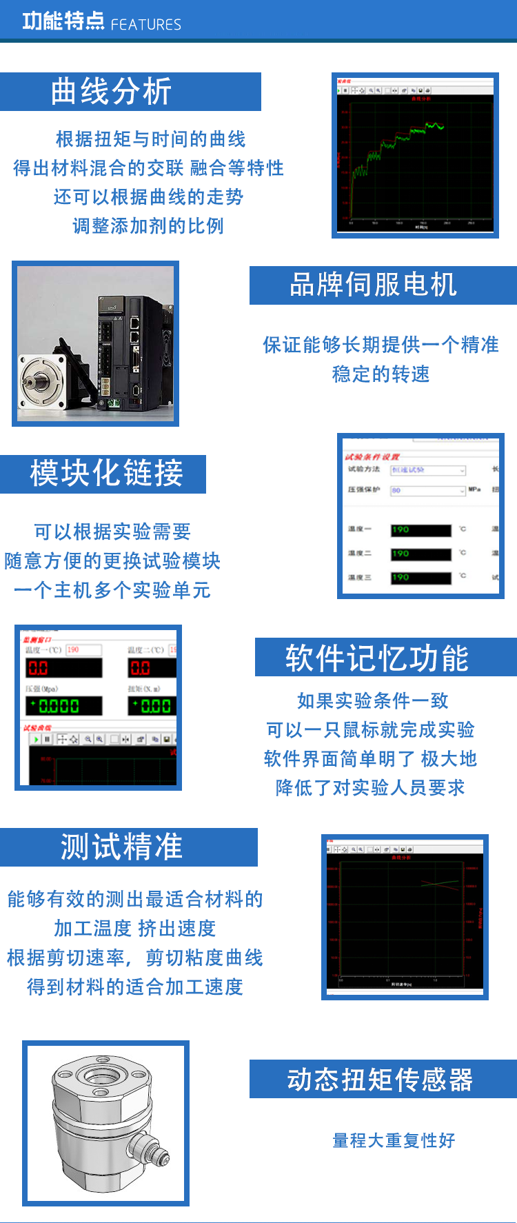 ZJL系列轉(zhuǎn)矩流變儀,除了其主要部分的主機(jī)、擠出機(jī)、混煉器、計(jì)算機(jī)外,還可根據(jù)需要配有自動(dòng)稱重單元,測(cè)徑單元,三輥壓延,螺桿擠出機(jī),吹膜機(jī),帶狀試樣壓光及牽引單元、膜質(zhì)量測(cè)試單元。