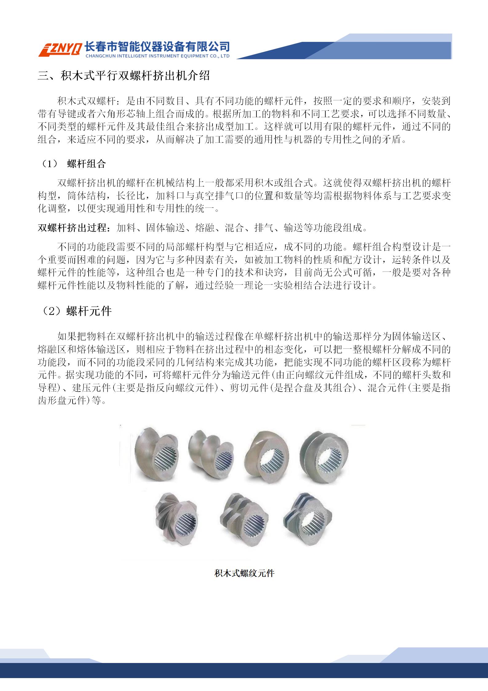簡要描述:積木式雙螺桿:是由不同數(shù)目、具有不同功能的螺桿元件,按照一定的要求和順序,安裝到帶有導(dǎo)鍵或者六角形芯軸上組合而成的。根據(jù)所加工的物料和不同工藝要求,可以選擇不同數(shù)量、不同類型的螺桿元件及其最佳組合來擠出成型加工。這樣就可以用有限的螺桿元件,通過不同的組合,來適應(yīng)不同的要求,從而解決了加工需要的通用性與機器的專用性之間的矛盾。